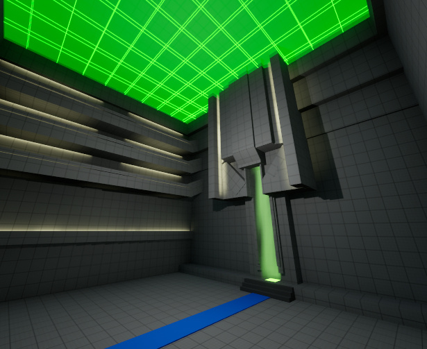 It’s a small control area that sets the tone and creates a clear “you are allowed to pass” moment before moving to the other side.The bright green elements act as guidance and focus, pulling the player toward the interaction point and reinforcing that this area exists to control traversal and lead into the next section.