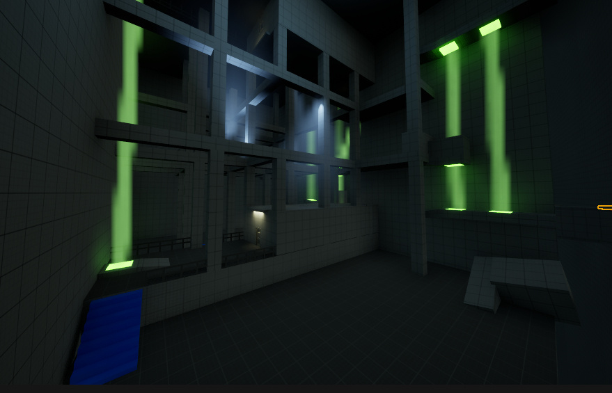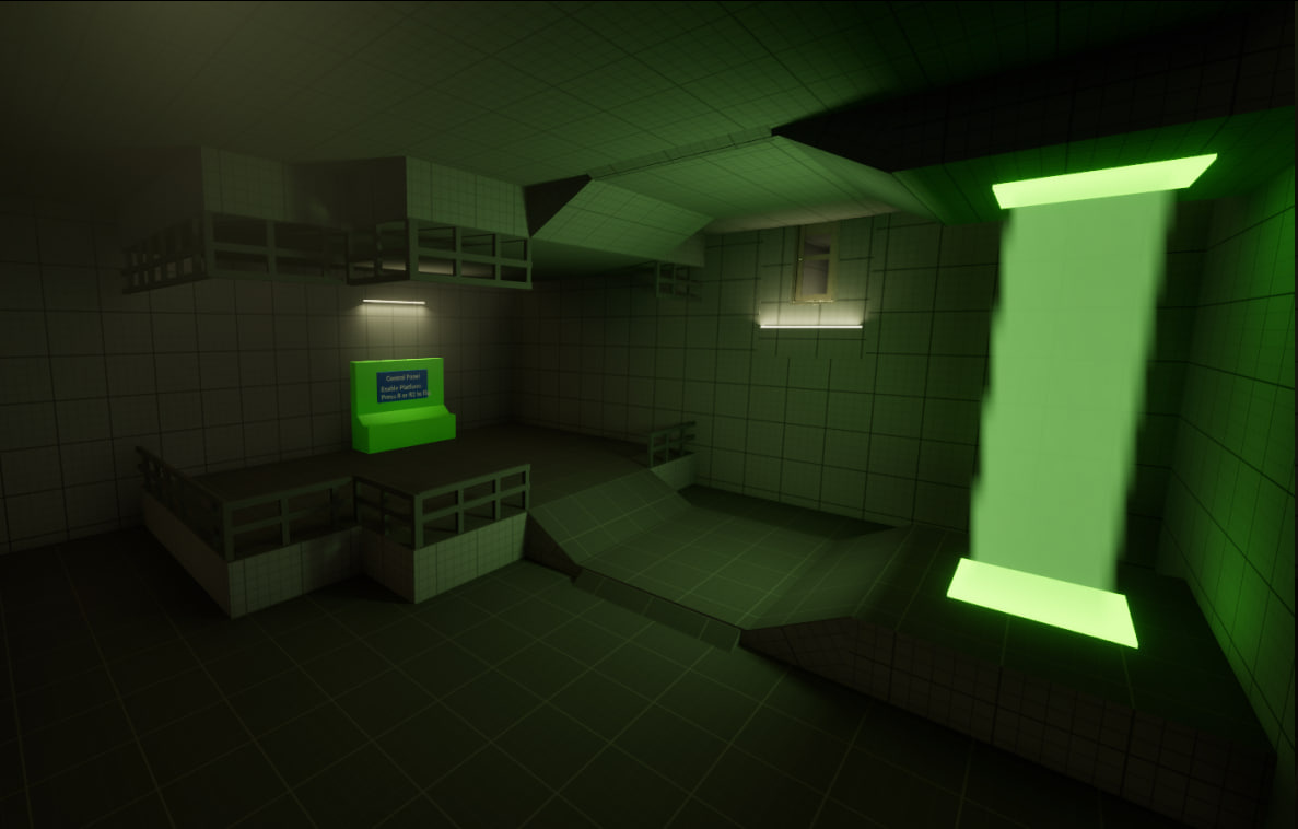 My goal during the whole project was to make the player feel like they are discovering parts of a massive facility, sometimes small spaces and sometimes large reveals like this. That contrast helps sell the scale, similar to how Portal uses big industrial rooms to make the world feel huge.This room is the main entrance hall: a central elevator shaft with a “carpet” path leading to it, plus balconies and side platforms that create depth and show multiple layers of space. The layout suggests this place used to be active, like it was once full of people working here.