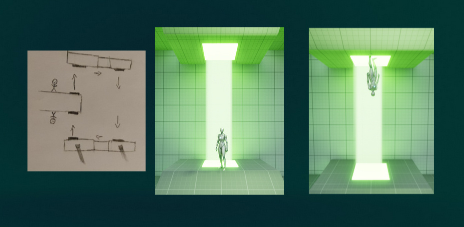 The gravity flip is a traversal feature that lets the player switch orientation and walk on the opposite surface. It turns one room into two usable spaces, and it creates reveal moments where the player recognizes a location from a completely new angle.To keep it readable, I used clear “flip points” with strong visual language (bright light / high contrast) so the player always understands:•Where flipping is possible