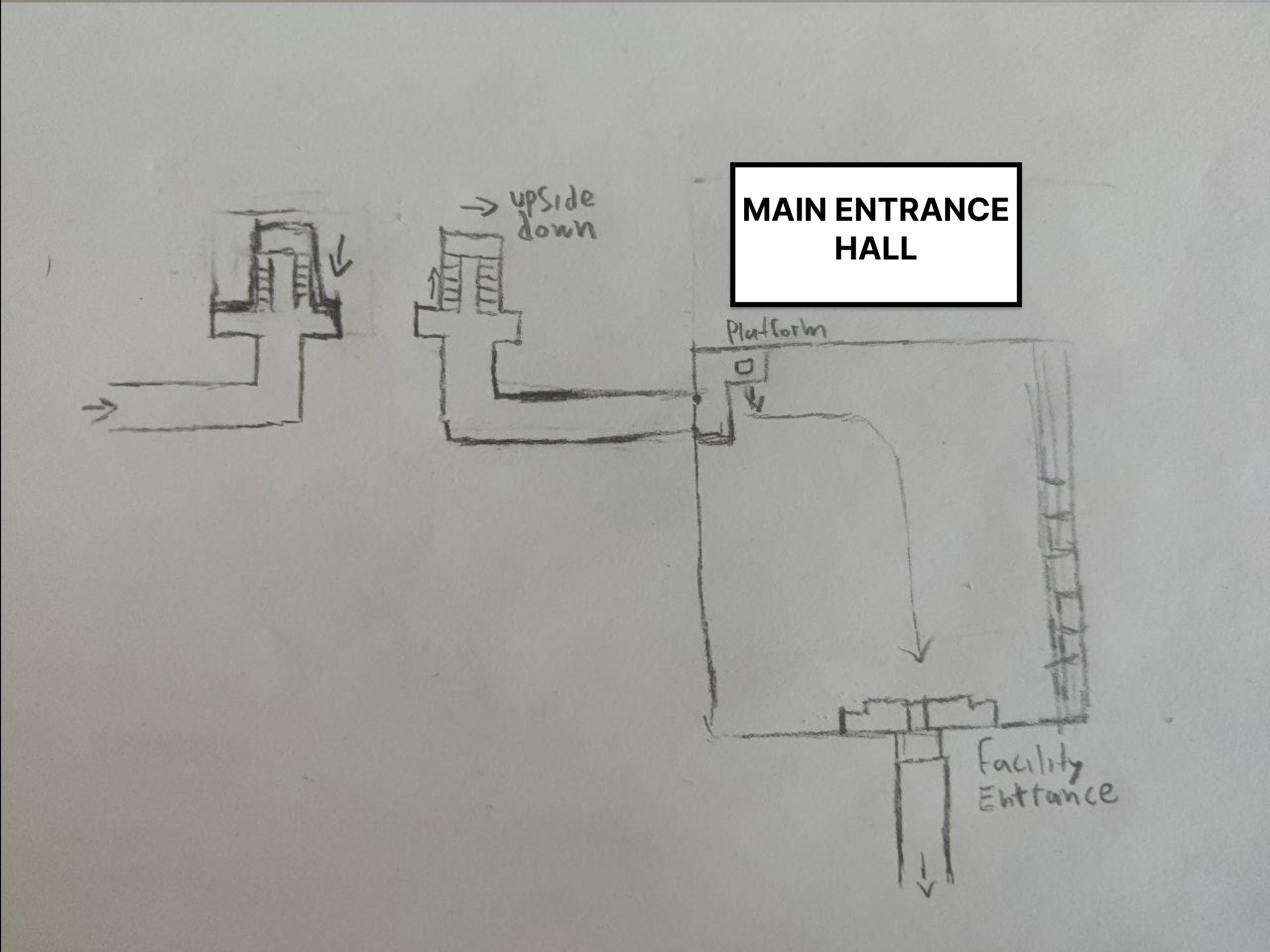 This space is the entrance of the facility, the first moment where the player feels like they are crossing into a controlled place.I designed it to work like a gate / checkpoint.